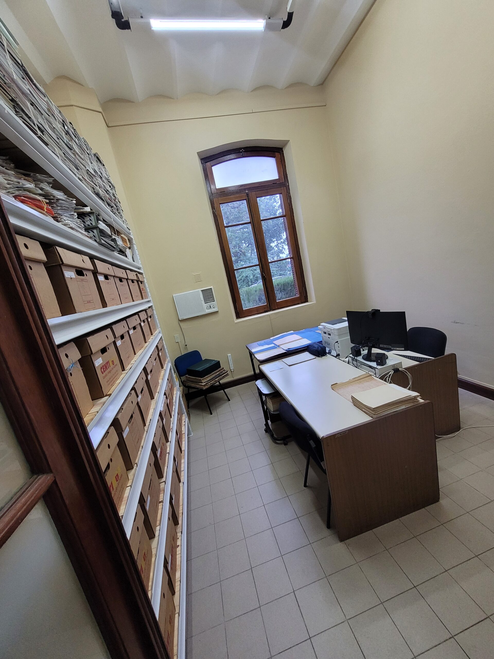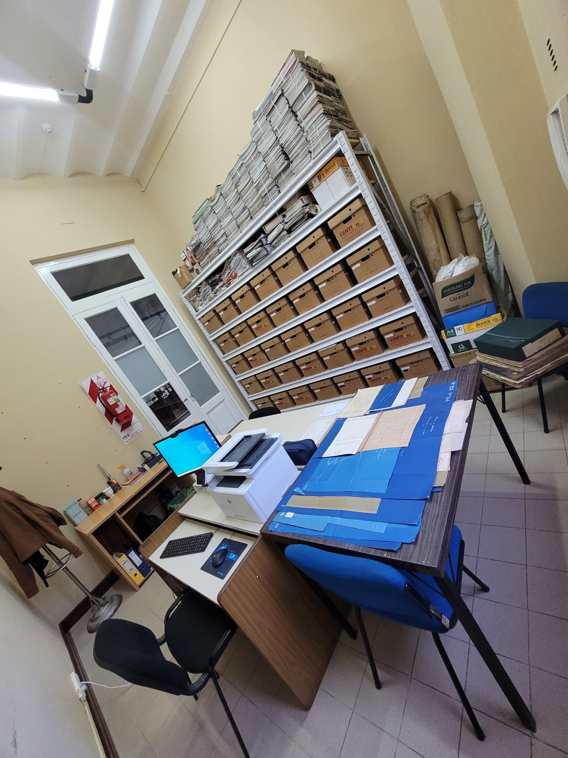 - Se gestionaron dos locaciones para el Archivo en el edificio principal del Enapro, una oficina y una sala. Se proyecta usar la primera como sala de consulta y la segunda como espacio de trabajo para el tratamiento archivístico y almacenamiento del acervo documental. Hasta que se efectúe la adecuación de la sala, el Archivo se encuentra ubicado en la oficina. Se han aprovechado los descartes mobiliarios de otros sectores para equipar la misma y delimitar zonas según el flujo de trabajo establecido, a saber: preparación de los materiales (limpieza y aplanado), digitalización y descripción de los mismos.